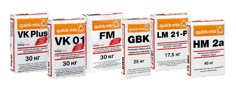 Благодаря множеству возможных комбинаций камня и раствора, фасады из лицевого кирпича всегда останутся одним из основных инструментов выражения индивидуального стиля. Своим клиентам компания quick-mix предлагает широкий ассортимент материалов для кладки кирпича, монтажа облицовочной плитки, затирки и расшивки межплиточных швов. Выбор соответствующего оформления швов сделает этот стиль еще более эффектным с помощью Цветных кладочных растворов марки «V.O.R.», а строение здания энергоэффективным благодаря теплоизоляционным кладочным растворам с перлитом и раствором для заполнения щелей и швов.Смеси представляют собой составы, изготовленные на основе цемента с добавлением специальных добавок и пигментов. Благодаря специально разработанной комбинации различных фракций песка, кладочные растворы quick-mix при укладке формируют надежный «скелет» (каркас), который позволяет в несколько раз увеличить количество уложенных рядов кирпича по сравнению с другими кладочными растворами.В состав всех цветных кладочных растворов V.O.R. от quick-mix входит оригинальный трасс (горная порода, образовавшаяся из продуктов вулканического извержения), поступающий к нам на производство напрямую из Германии. Благодаря ему на нашем кладочном растворе никогда не будет высолов.Для правильного подбора кладочного раствора необходимо учитывать абсорбирующее свойство камня, его водопоглощение. В зависимости от степени водопоглощения кирпича следует выбирать растворы марки V.О.R., тщательно подобранные по степени водопоглощения кирпича от слабо и очень слабо абсорбирующего до экстремально и сильно абсорбирующего. Это обеспечивает максимальную степень сцепления кладочного раствора и кирпича. Достигаются максимальные характеристики по плотности и прочности кладочного раствора, повышающие срок службы кладки в целом.Потребителям представлены смеси в широком цветовом исполнении до 16-ти оттенков, что позволяет реализовывать разнообразные дизайнерские решения.